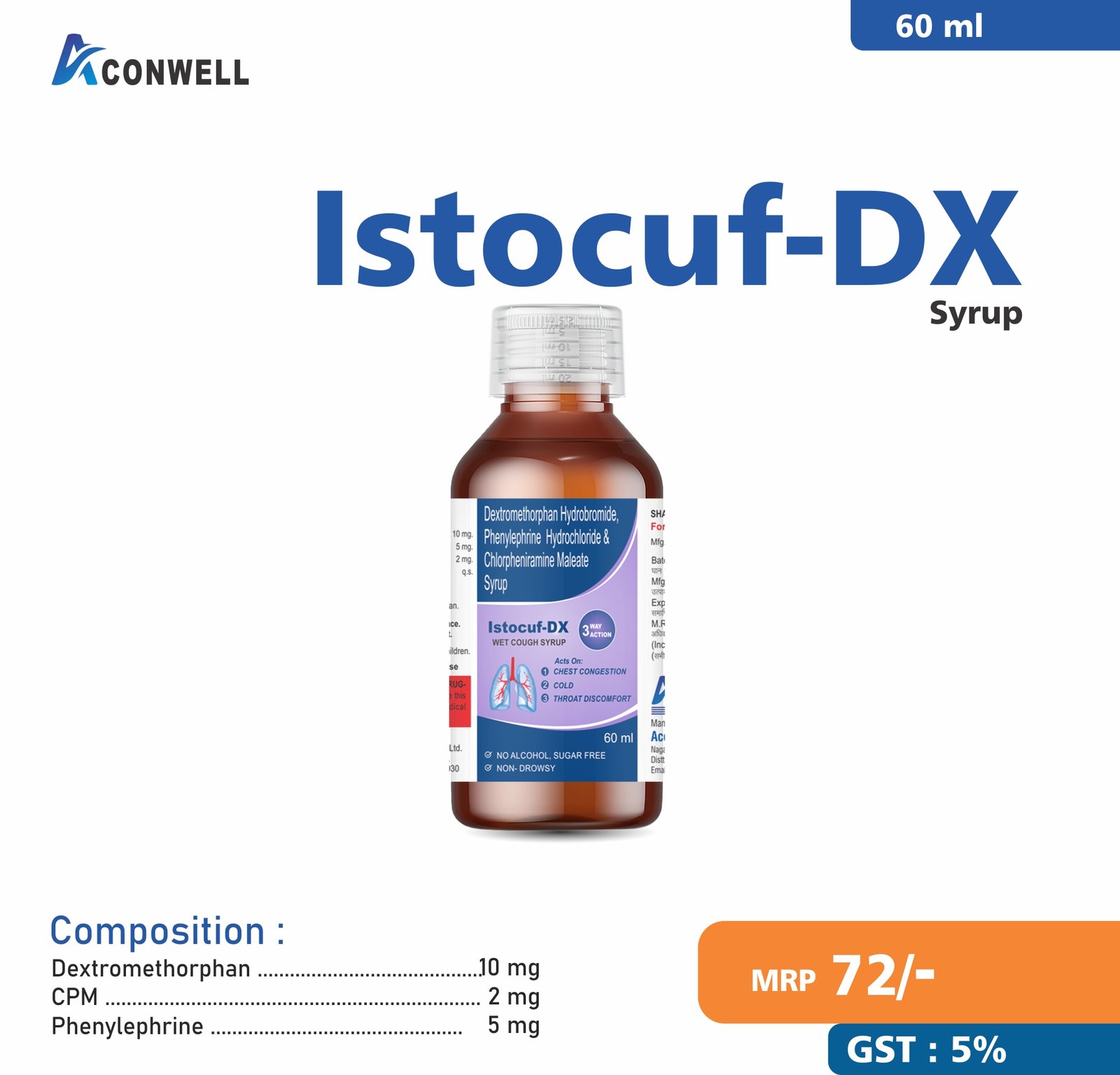 Composition : Levosalbutamol 1 mg, Ambroxol 30 mg & Guaiphenesin 50 mg